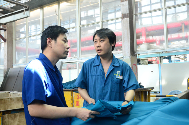 圖為公司家紡車間的趙山松(右)和韓延衛(wèi)(左)在對(duì)比優(yōu)化工藝后的下機(jī)產(chǎn)品。
