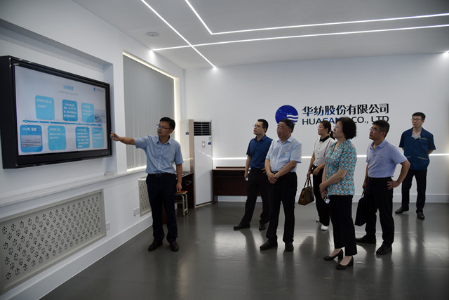 曹學軍一行先后參觀了花布車間、綜合辦公區(qū)、家紡展廳、研發(fā)創(chuàng)意中心、工程技術(shù)研究院、智云中心等部門和區(qū)域,并聽取了公司推進智能綠色工廠建設(shè)情況的匯報。