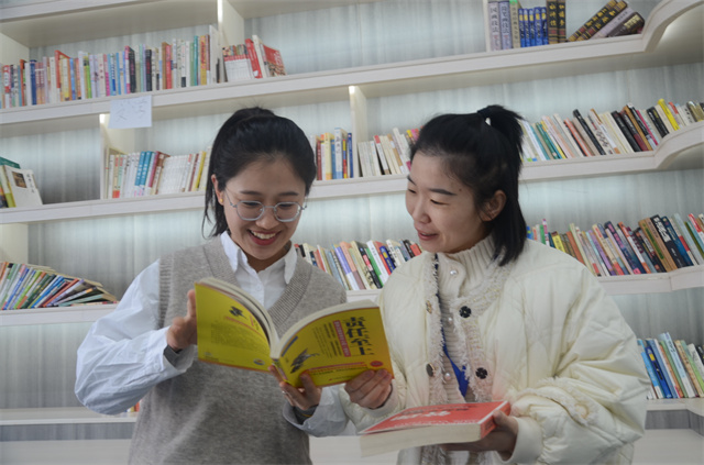 圖為公司女職工薛湛然(左)和蘆成雨(右),在職工書屋討論讀書心得的情形。