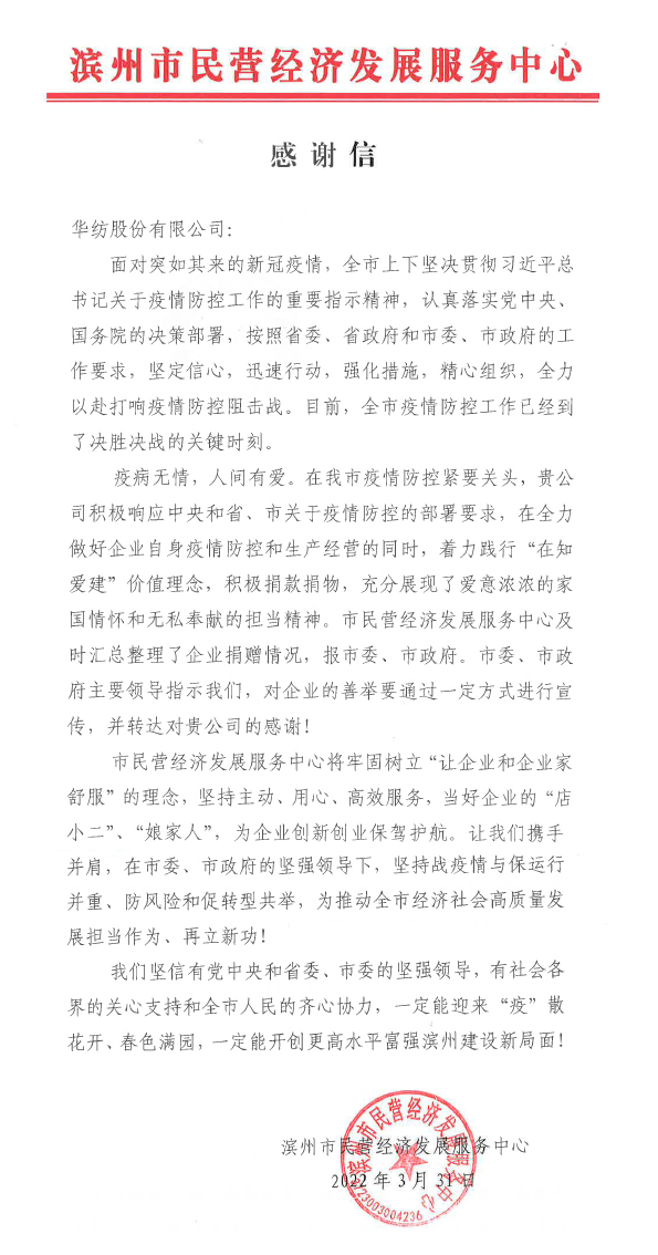 “疫病無情,人間有愛。在我市疫情防控緊要關(guān)頭,貴公司積極響應(yīng)中央和省、市關(guān)于疫情防控的部署要求,在全力做好企業(yè)自身疫情防控和生產(chǎn)經(jīng)營的同時,著力踐行‘在知愛建’價值理念,積極捐款捐物,充分展現(xiàn)了愛意濃濃的家國情懷和無私奉獻(xiàn)的擔(dān)當(dāng)精神……”這是3月31日濱州市民營經(jīng)濟(jì)發(fā)展服務(wù)中心發(fā)給公司感謝信中的一段話。
