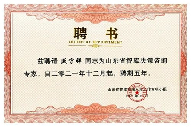 導(dǎo)讀:近日,接山東省智庫(kù)高端人才工作專項(xiàng)小組辦公室通知,公司董事長(zhǎng)盛守祥入選2021年山東省智庫(kù)高端人才,獲聘經(jīng)濟(jì)建設(shè)領(lǐng)域山東省智庫(kù)決策咨詢專家。