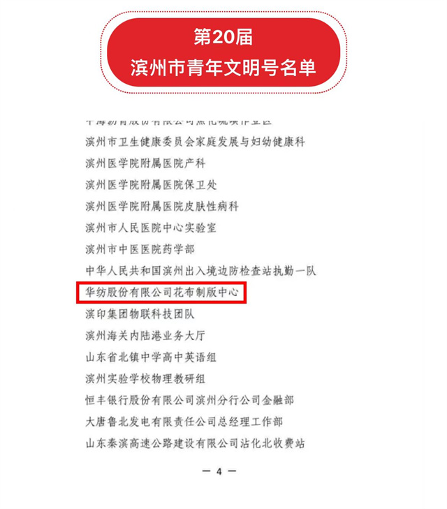 導(dǎo)讀:11月8日,濱州市創(chuàng)建青年文明號活動組委會發(fā)布《關(guān)于命名第20屆“濱州市青年文明號”的決定》,經(jīng)逐級認定、嚴格審核、社會公示,公司花布制版中心獲第20屆“濱州市青年文明號”