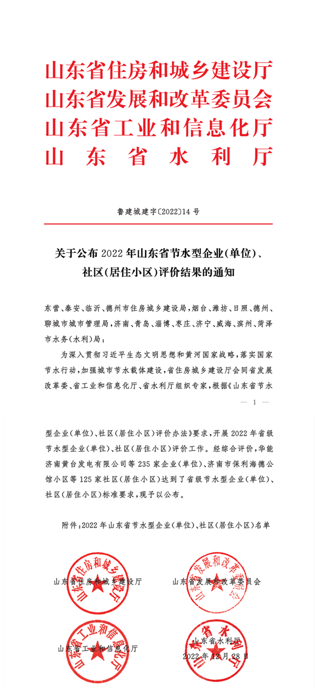近日,山東省住房和城鄉(xiāng)建設(shè)廳會同山東省發(fā)展和改革委員會、山東省工業(yè)和信息化廳、山東省水利廳發(fā)布了《關(guān)于公布2022年山東省節(jié)水型企業(yè)(單位)、社區(qū)(居住小區(qū))評價結(jié)果的通知。經(jīng)綜合評價,公司達到了省級節(jié)水型企業(yè)的標準要求,獲評山東省節(jié)水型企業(yè)。