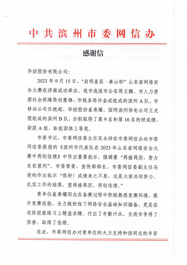 近日,公司收到一封來自濱州市委網(wǎng)信辦的感謝信,信中高度肯定了公司互聯(lián)信息部信息中心信息安全管理員崔乘耀在2023年9月15日“啟明星辰·泰山杯”山東省網(wǎng)絡(luò)安全大賽中所做出的突出貢獻(xiàn),信中指出:“貴單位崔乘耀同志在備賽過程中積極熟悉競(jìng)賽環(huán)境、提升競(jìng)賽技能,全力做好線下網(wǎng)絡(luò)安全基礎(chǔ)知識(shí)儲(chǔ)備,更是在攻防技能練習(xí)上精益求精,付出了辛勤汗水,為我市爭(zhēng)得了榮譽(yù),取得了佳績。”