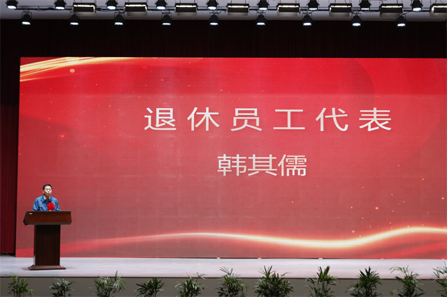 盛守祥為退休員工代表頒發(fā)榮譽(yù)證書(shū),退休員工韓其儒代表80位退休同志做表態(tài)發(fā)言。