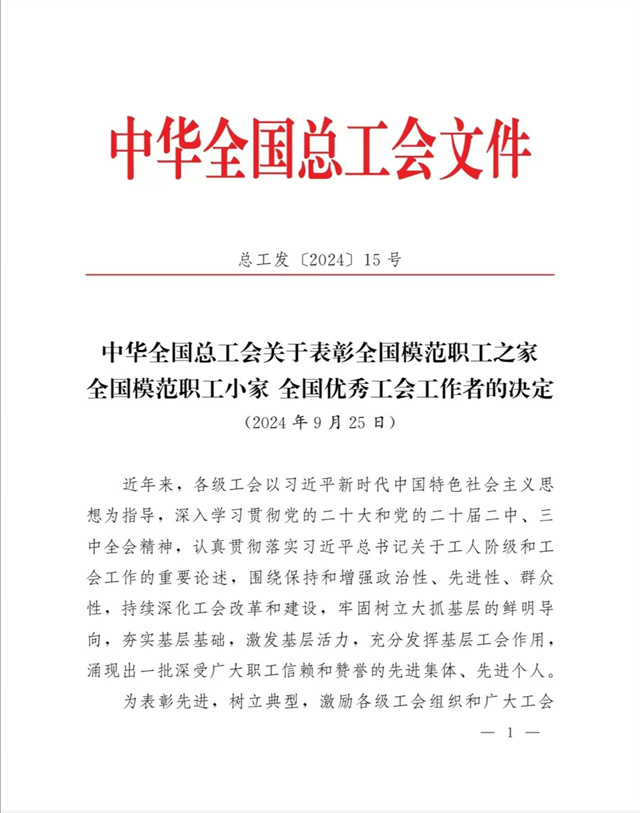近日,中華全國總工會印發(fā)《中華全國總工會關于表彰全國模范職工之家、全國模范職工小家、全國優(yōu)秀工會工作者的決定》,公司工會委員會榮獲“全國模范職工之家”榮譽稱號。