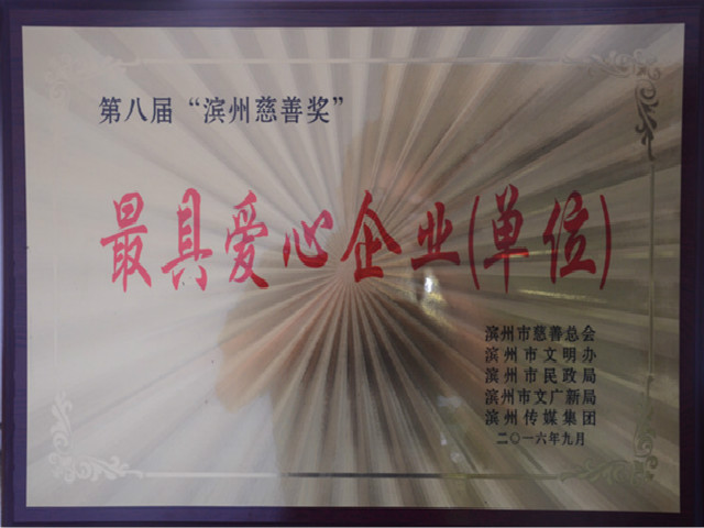 近日,由濱州市慈善總會、市精神文明建設(shè)委員會辦公室、市民政局、市文化廣電新聞出版局、濱州傳媒集團(tuán)等聯(lián)合舉辦的第八屆“濱州慈善獎”評選表彰活動圓滿結(jié)束,公司以對慈善事業(yè)的突出貢獻(xiàn),榮獲“最具愛心企業(yè)(單位)”稱號。